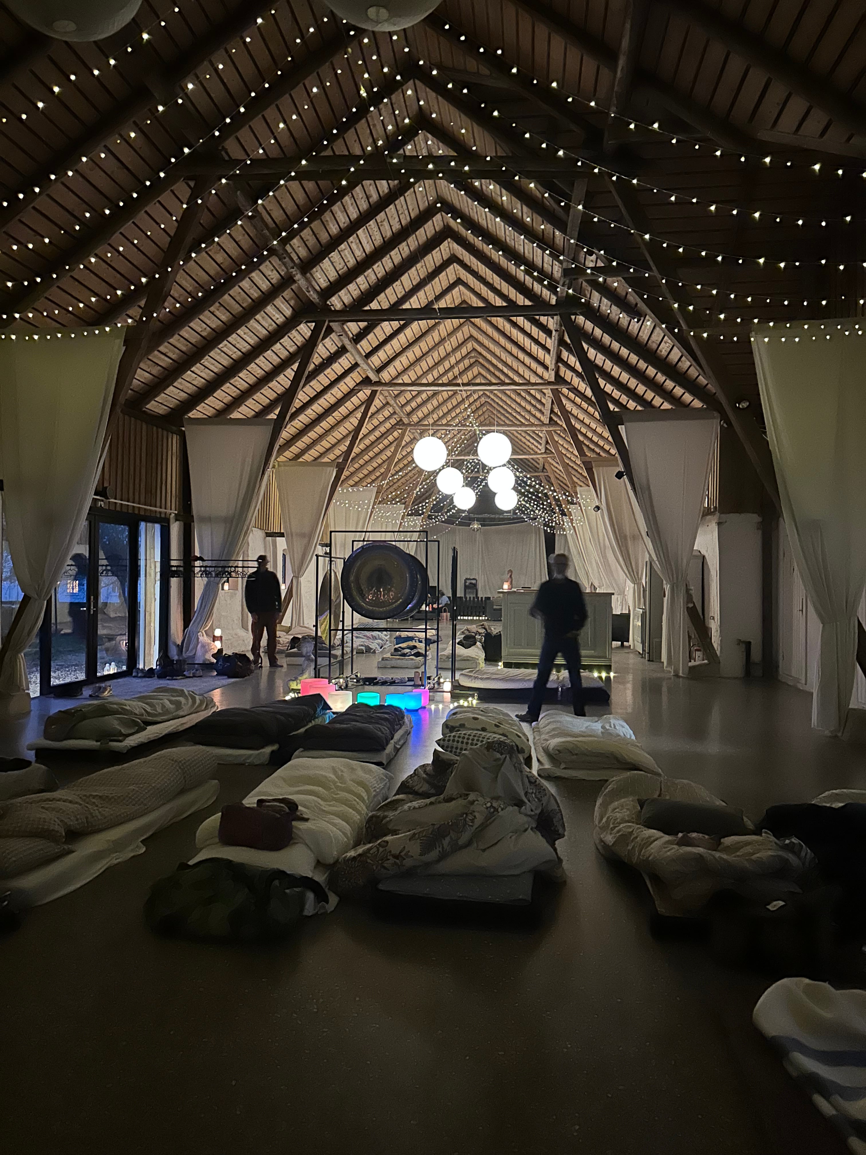 Spiller vi gongerne op og derefter sænker vi alle gongernes vibrationer, som du sover i hele natten. Vi svøber dig ind i vibrationer, alt imens du sover - eller som de fleste glider ud og ind ad søvnen og føler gongerne vugger dig. En helt særlig oplevelse.